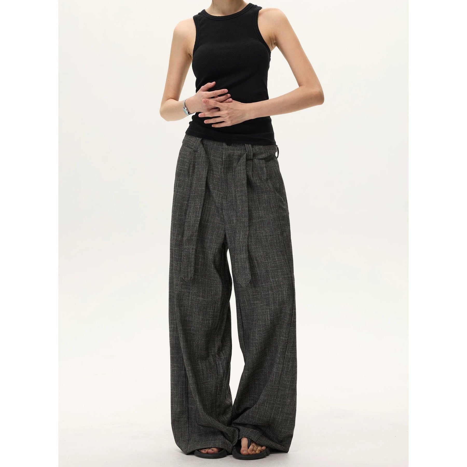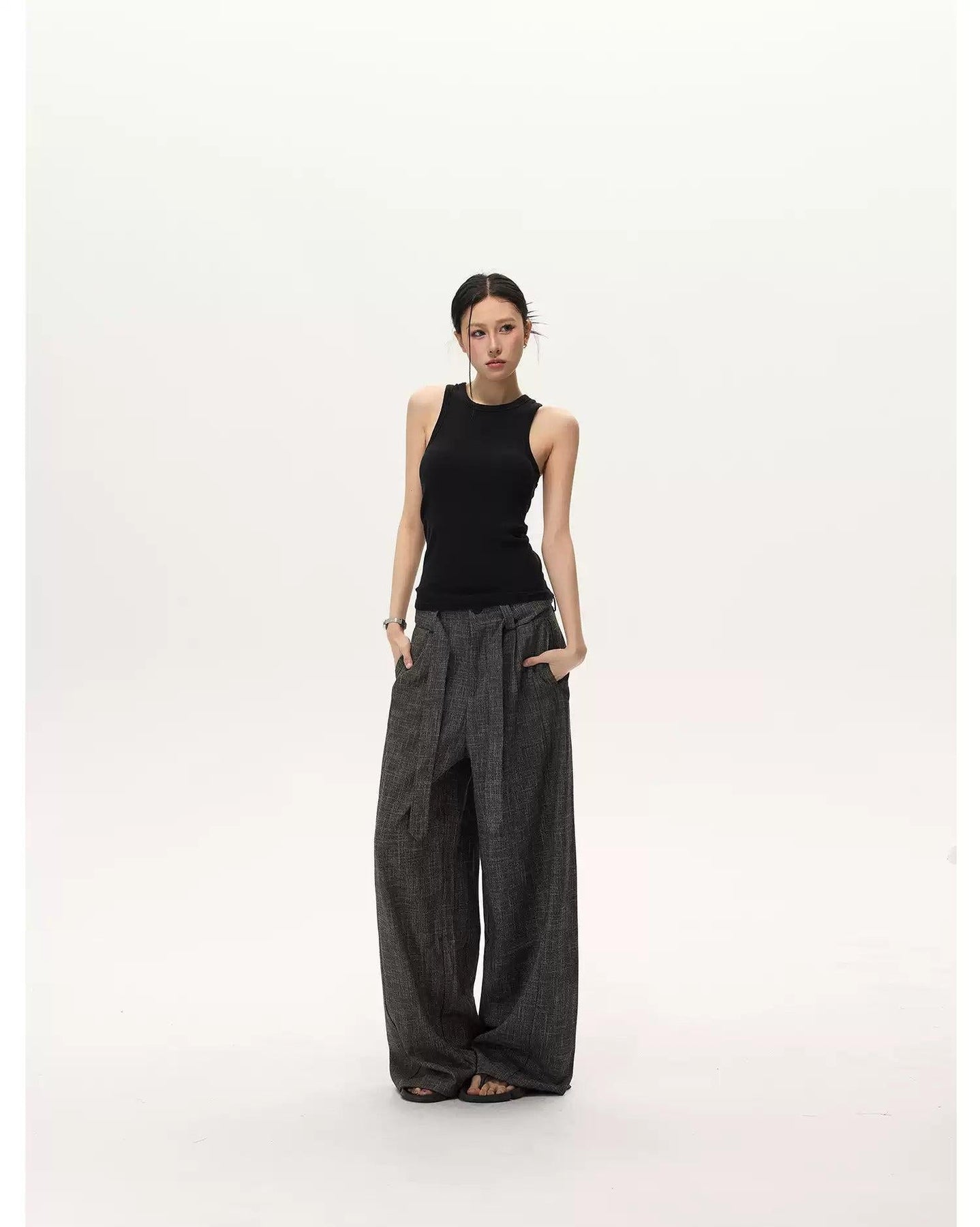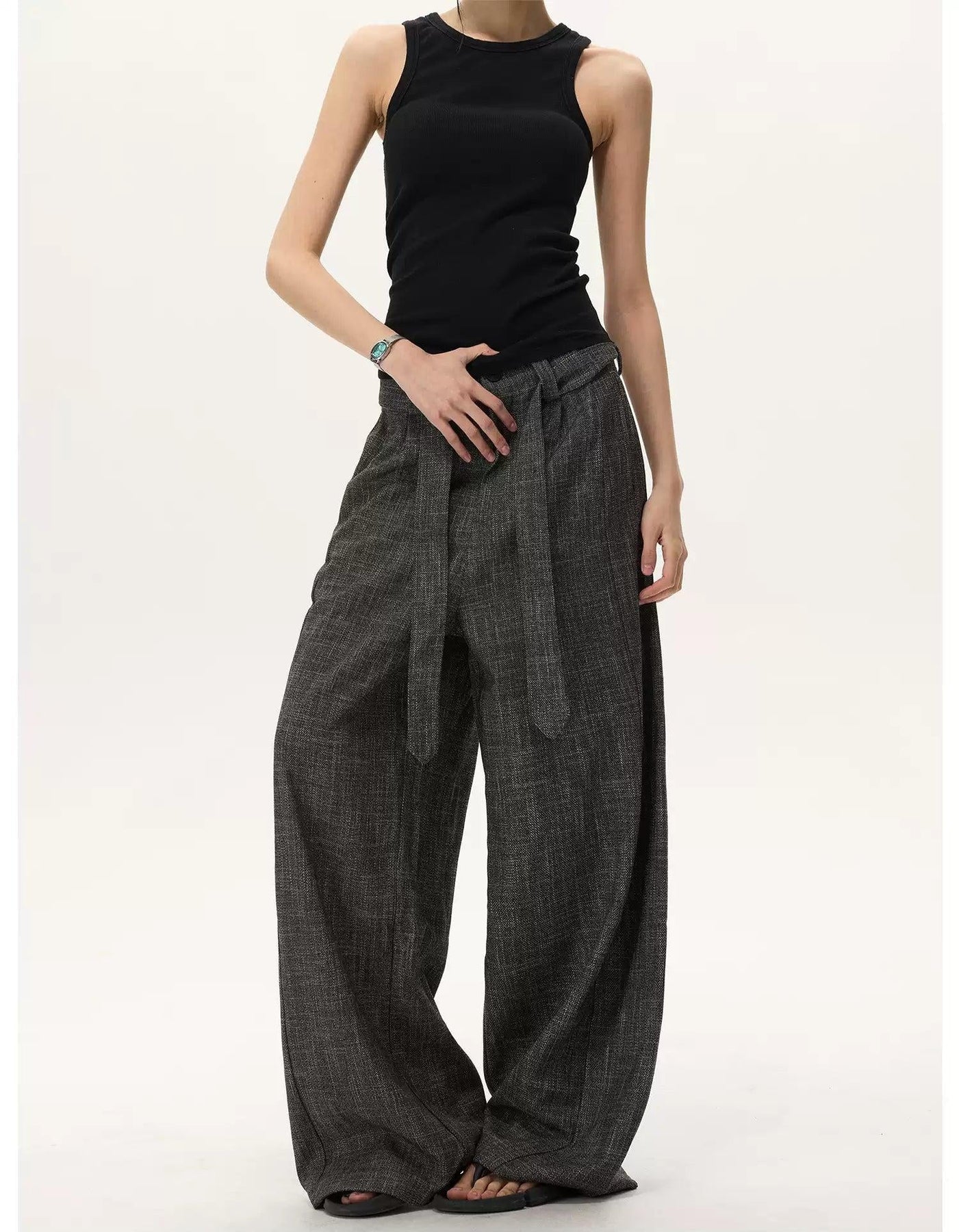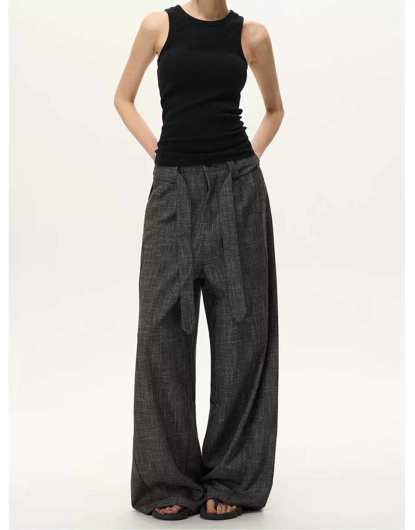 Cloth Belt Textured Loose Fit Pants