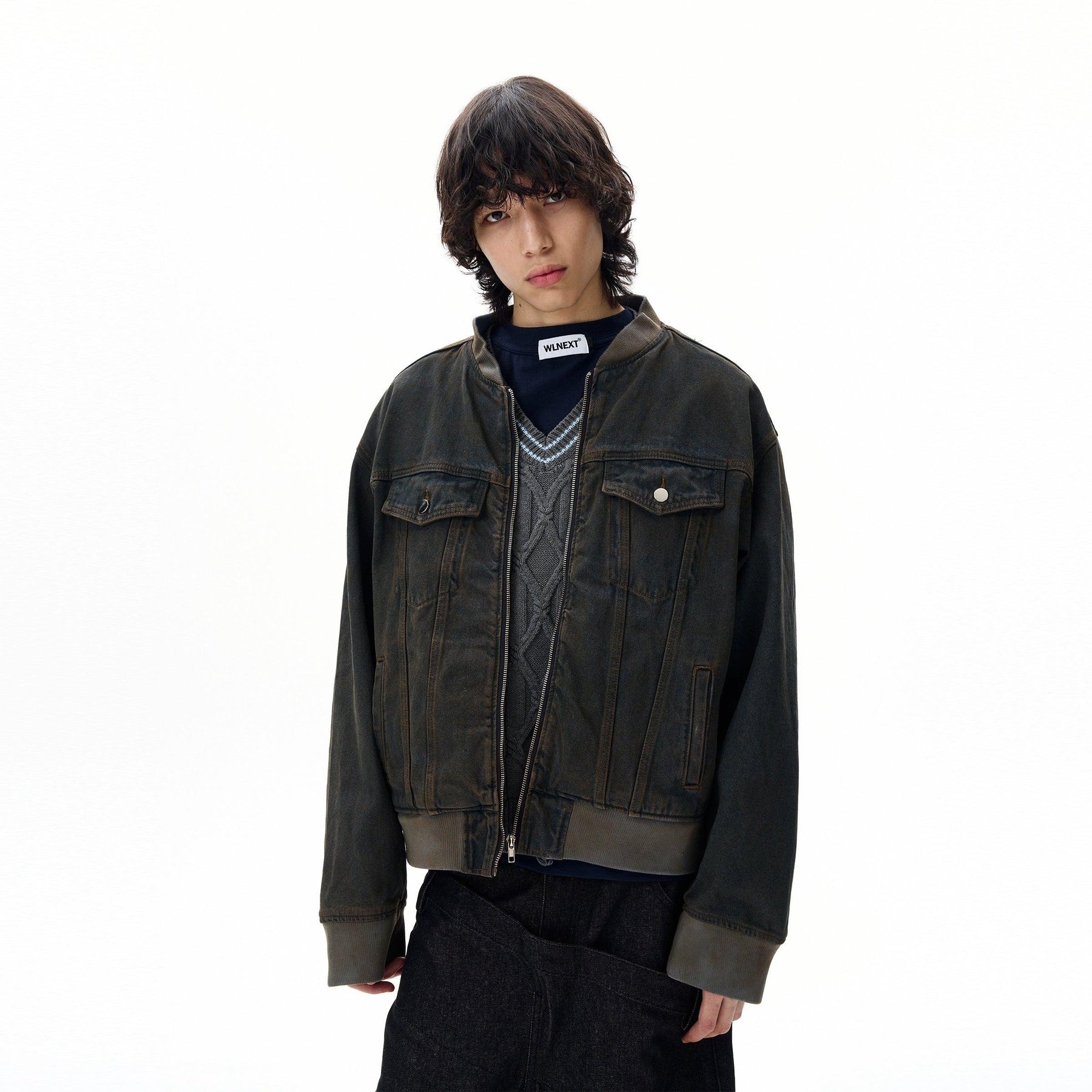 Distressed Wash Ribbed Hem Denim Jacket