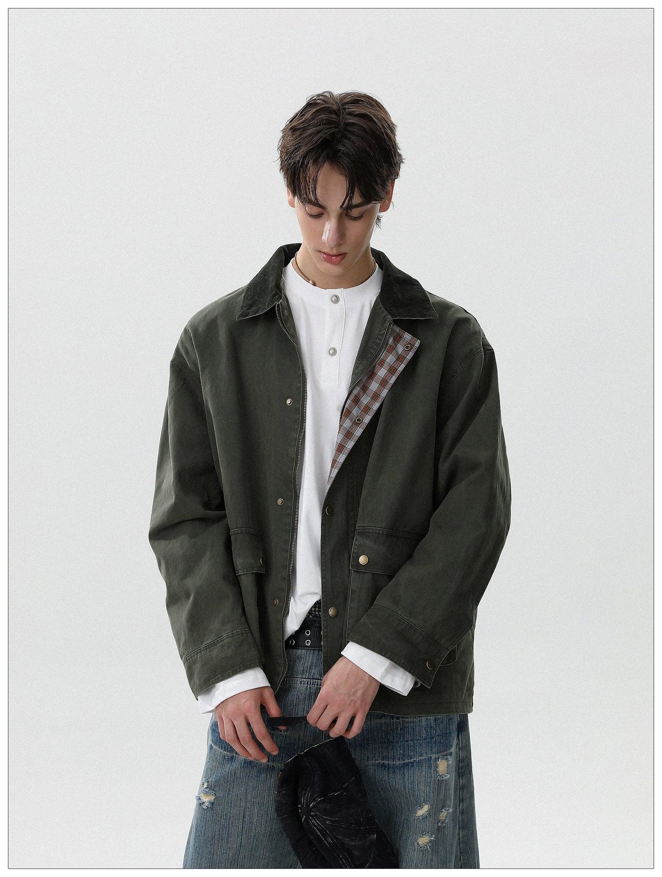 Plaid Lining Snap Buttoned Jacket